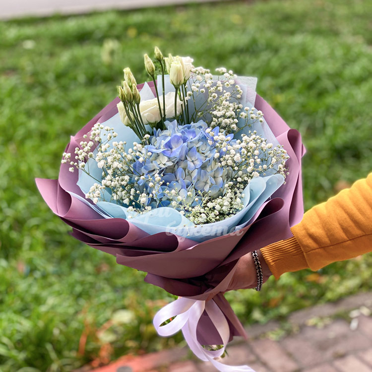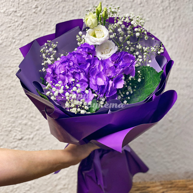 Букет из фиолетовых гортензий с гипсофилой