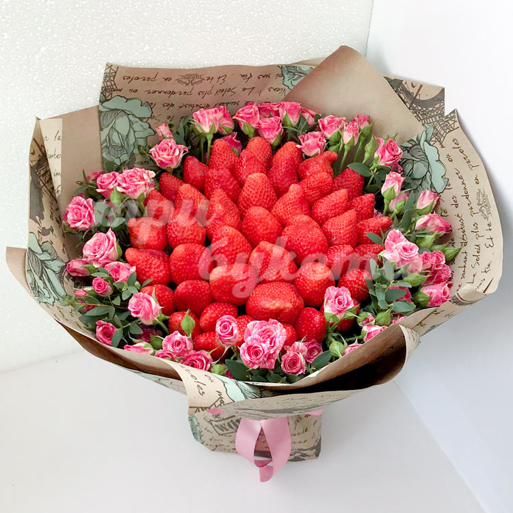 Букет из клубники и красно-белых роз