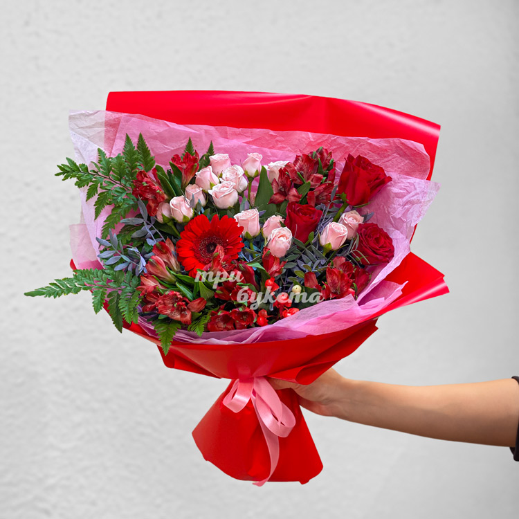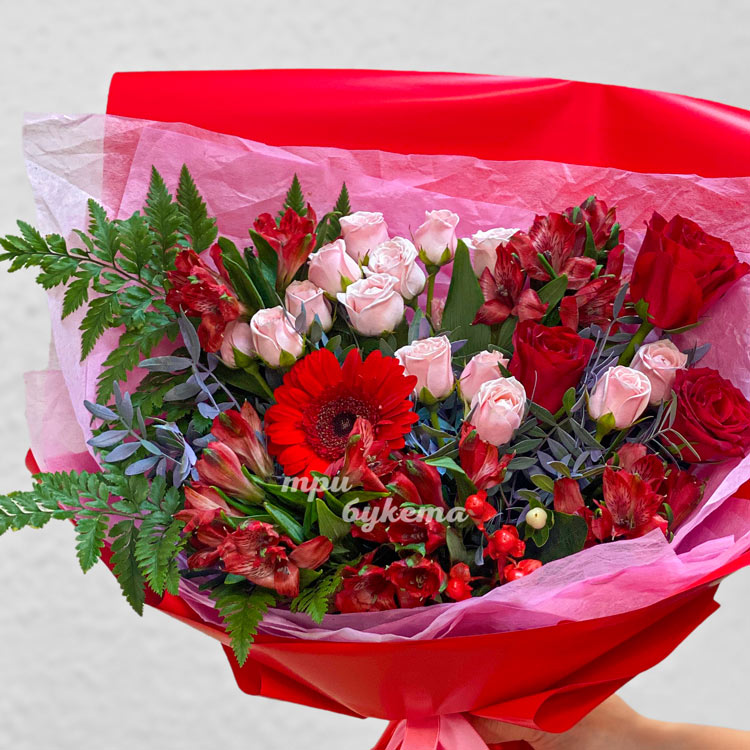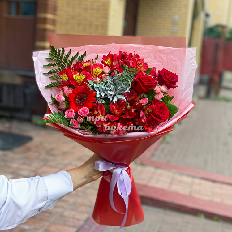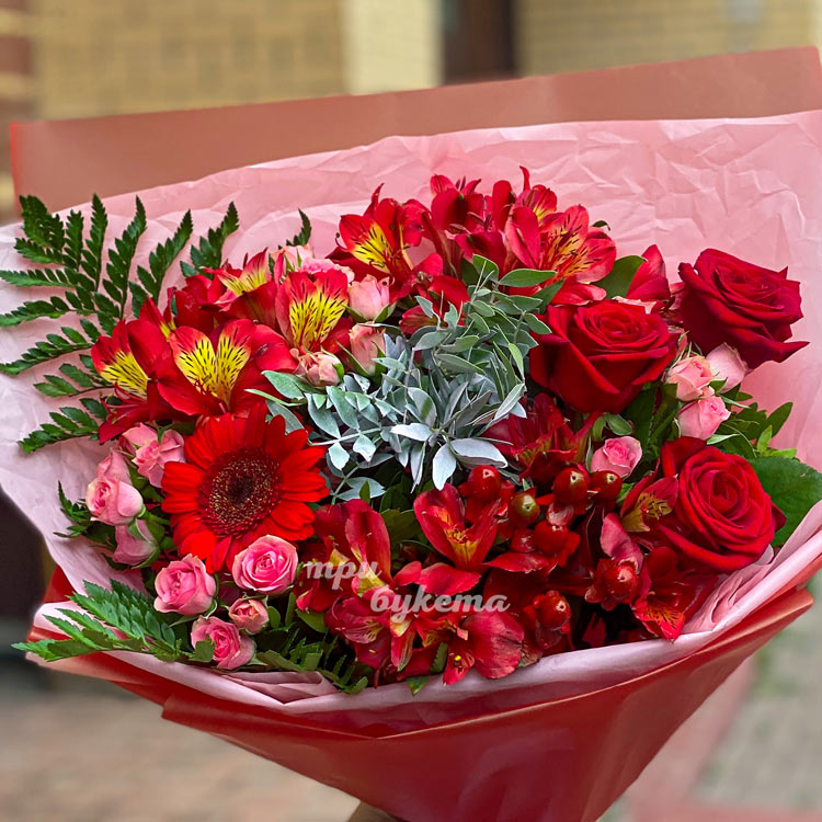 Букет красных альстромерий, роз и зелени