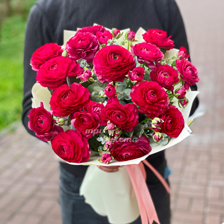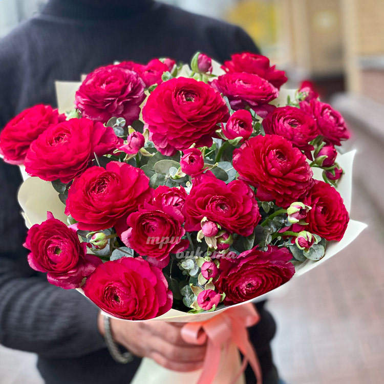 Букет красных ранункулюсов с эвкалиптом