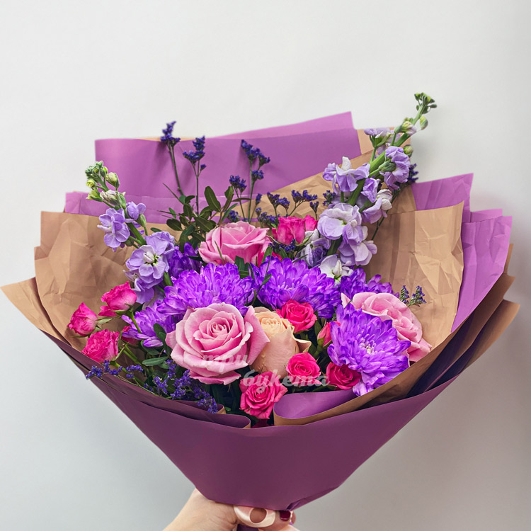 Букет розовых роз и сиреневых хризантем