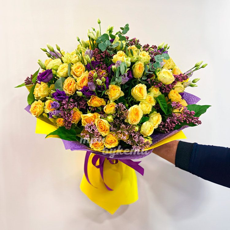 Букет желтых роз с эустомами и сиренью