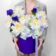 Коробка ярких роз и гортензии с хлопком