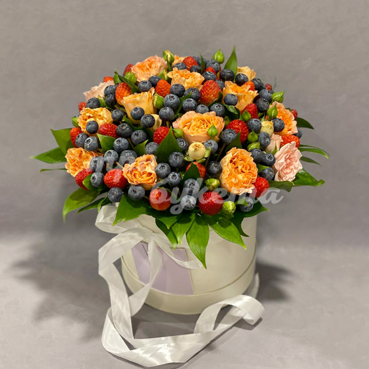 Пионовидные розы и ягоды в коробке