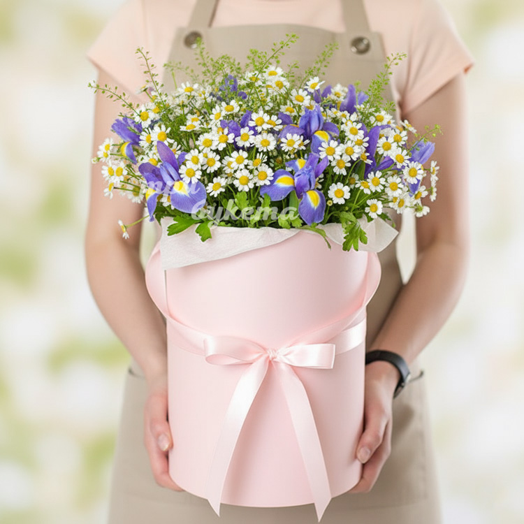 Ромашки и ирисы в шляпной коробке