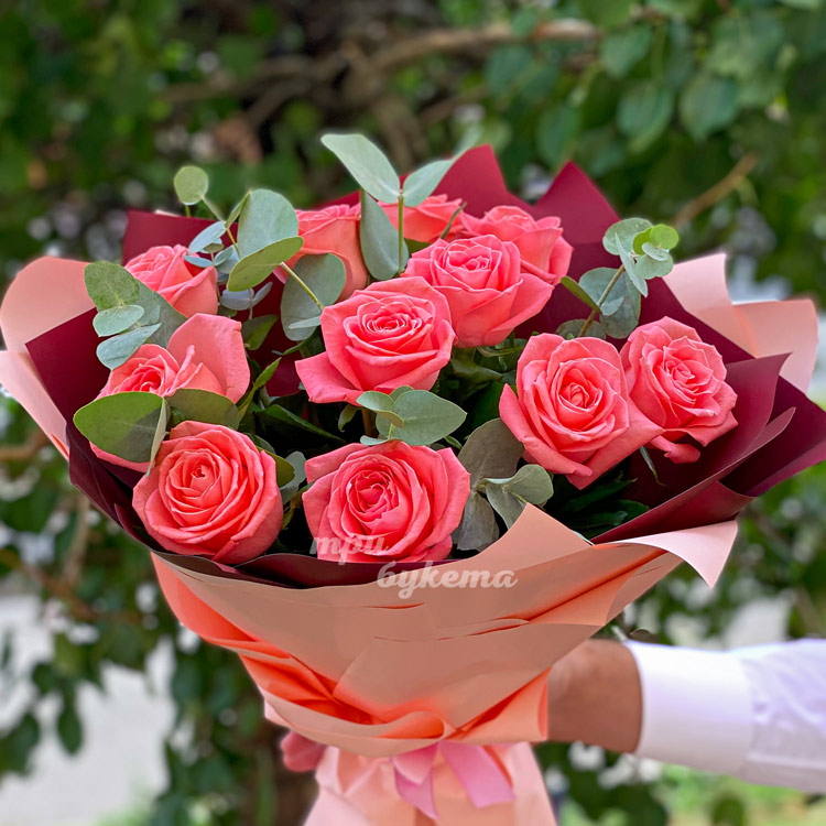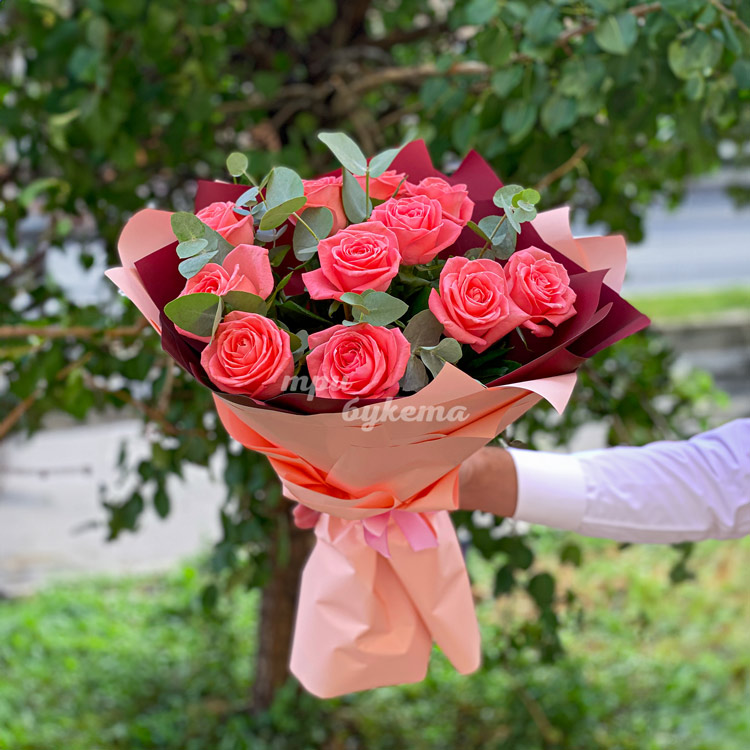Розовый букет из 11 роз и эвкалипта