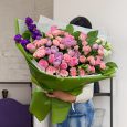 Розовый букет из пионов, роз и маттиол
